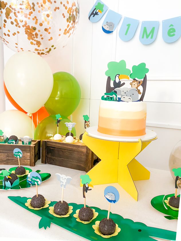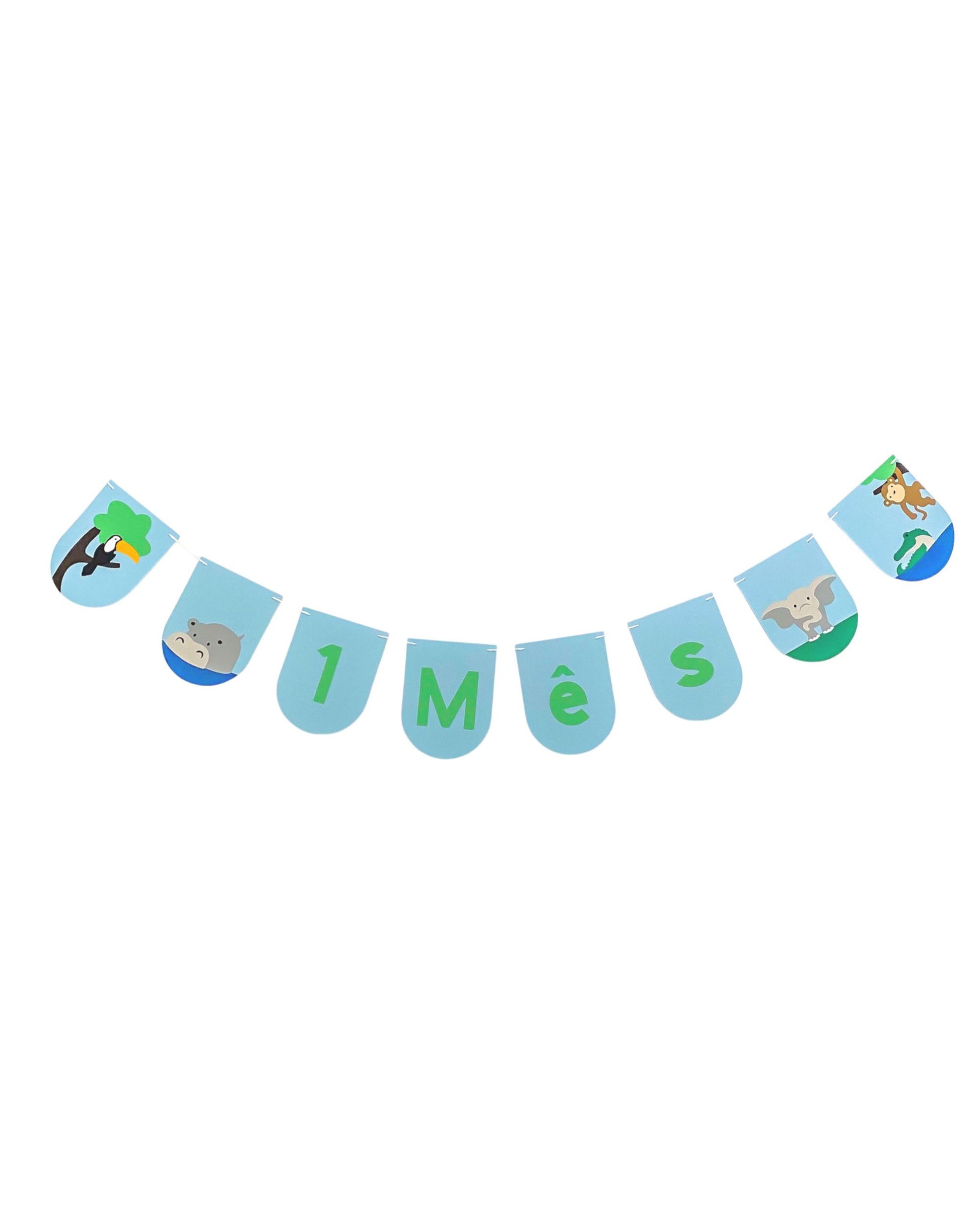 4 bandeirolas contendo: 01 tucano, 01 elefante, 01 hipopótamo, 01 macado e 01 jacaré (medindo aprox. 13,5 cm alt x 10,5 cm larg) + bandeirolas da mesma alt e larg. com o nome ou idade personalizável.