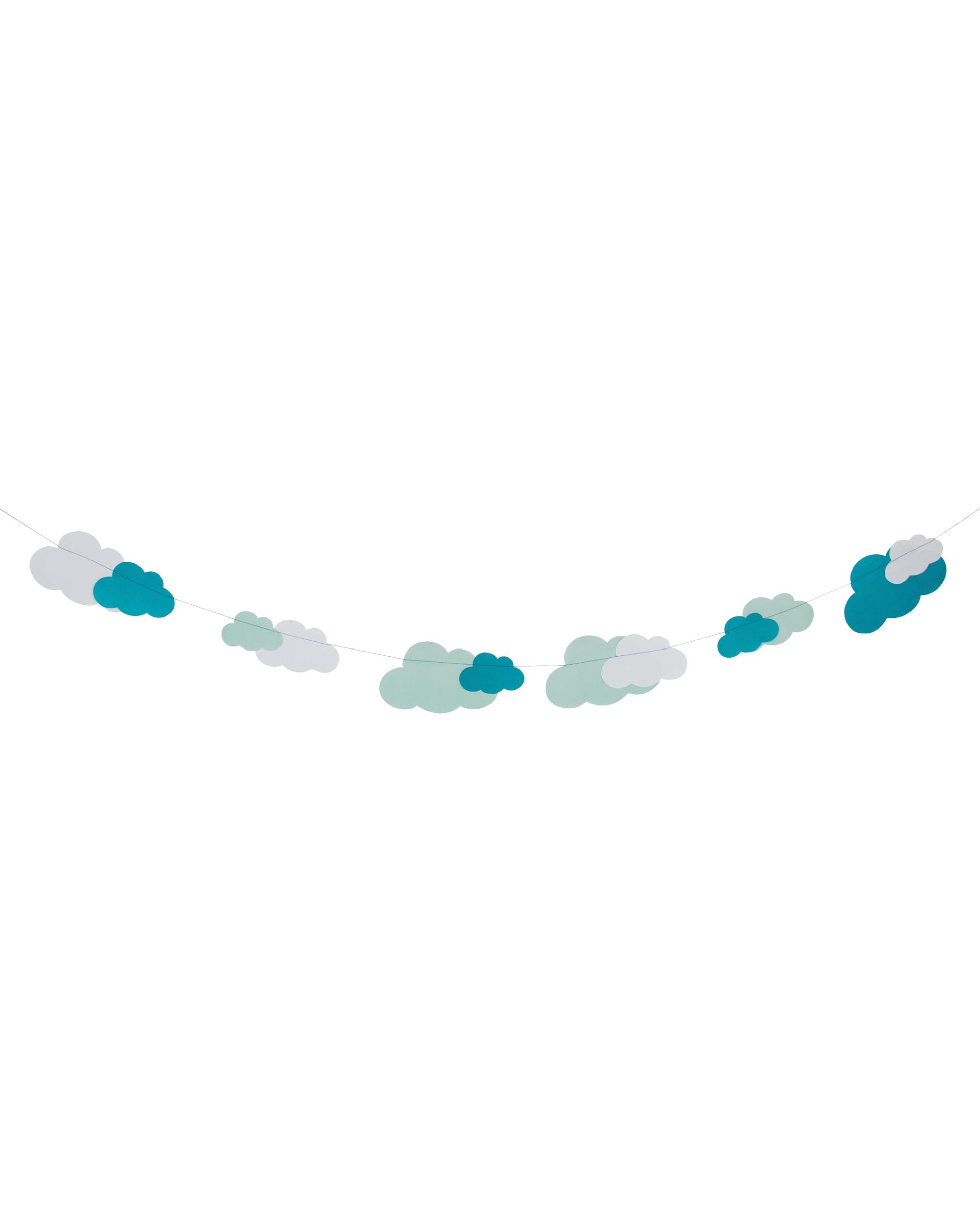 Guirlanda de nuvens de papel em diferentes tamanhos costuradas em linha branca