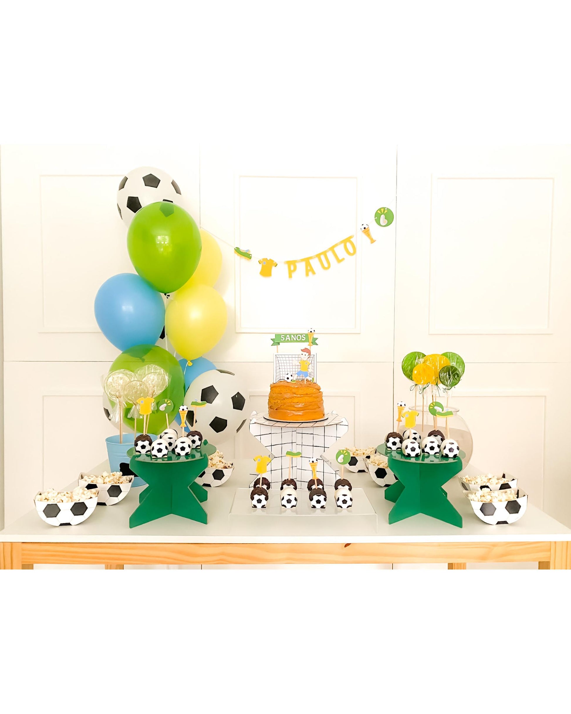 3 elementos em papel colorido e palitos de madeira sendo: gol medindo aprox. 12cm larg x 8,5cm sem consider o palito / jogador (personalização nos detalhes do pedido) medindo aprox. 8cm de larg. X 10cm de alt. sem considerar o palito e faixa personalizável (nome ou idade) medindo aprox. 14cm de larg x 20cm de alt. já considerando os palitos). A personalização (nome ou idade) deve ser informada no campo observação ao final da compra.