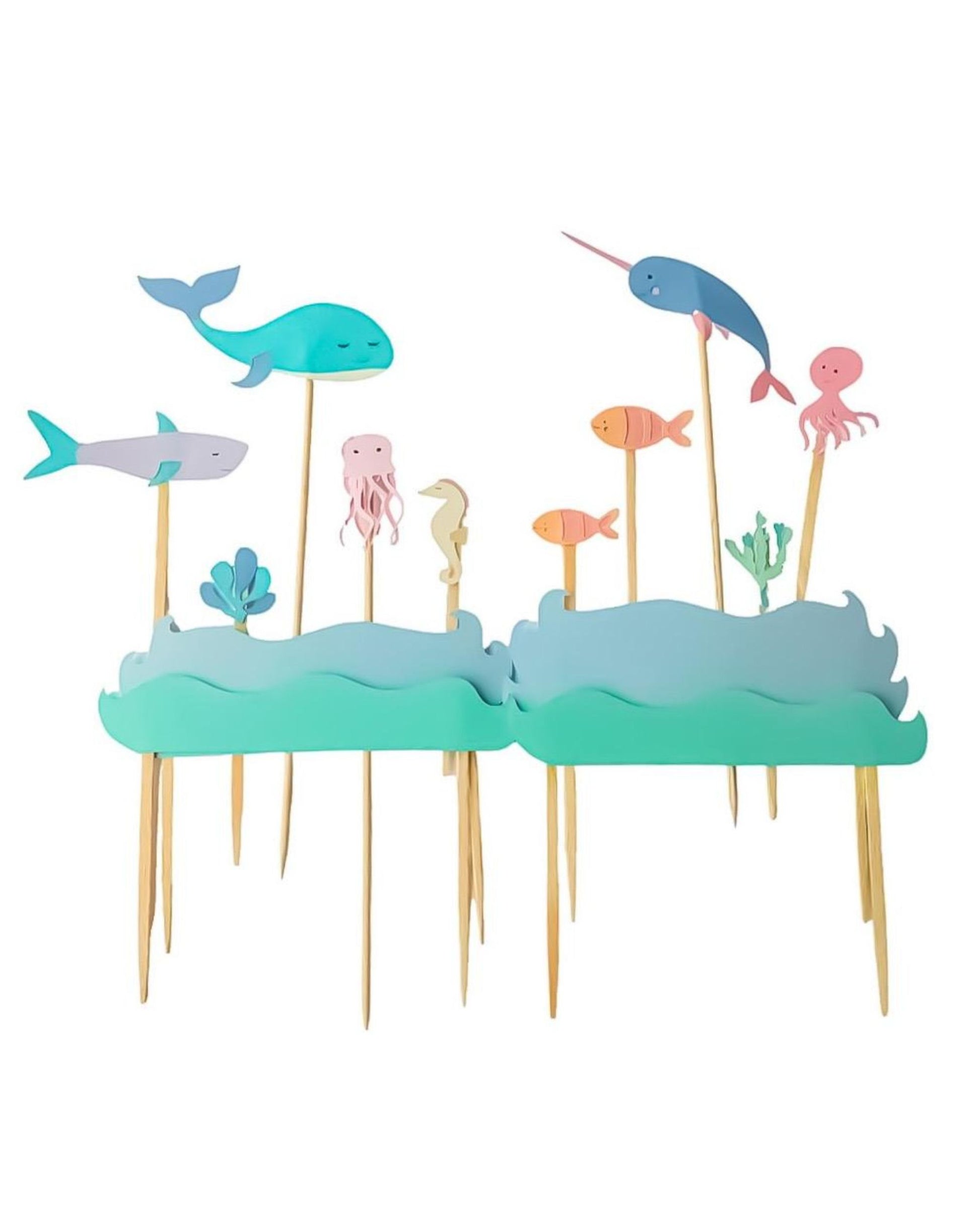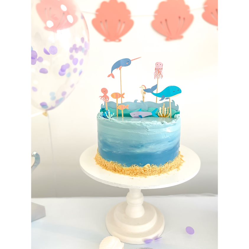 Contém 15 itens para espetar no bolo, sendo eles: 4 peças de mar, 3 plantas, 2 peixes, nárnia, polvo, lula, cavalo marinho, tubarão e baleia