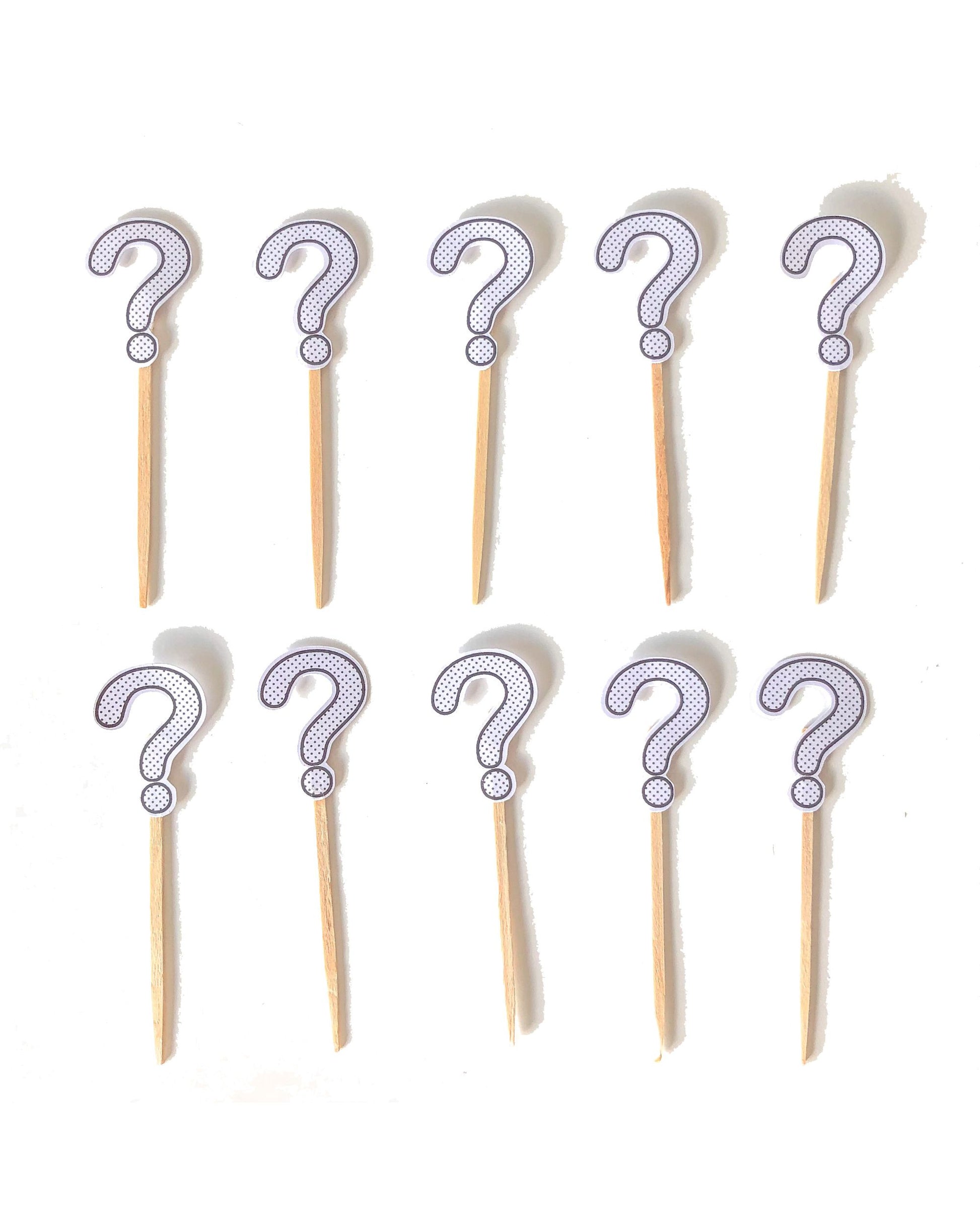 10 topos interrogação medindo 4,3cm A x 3cm L (sem considerar o palito)